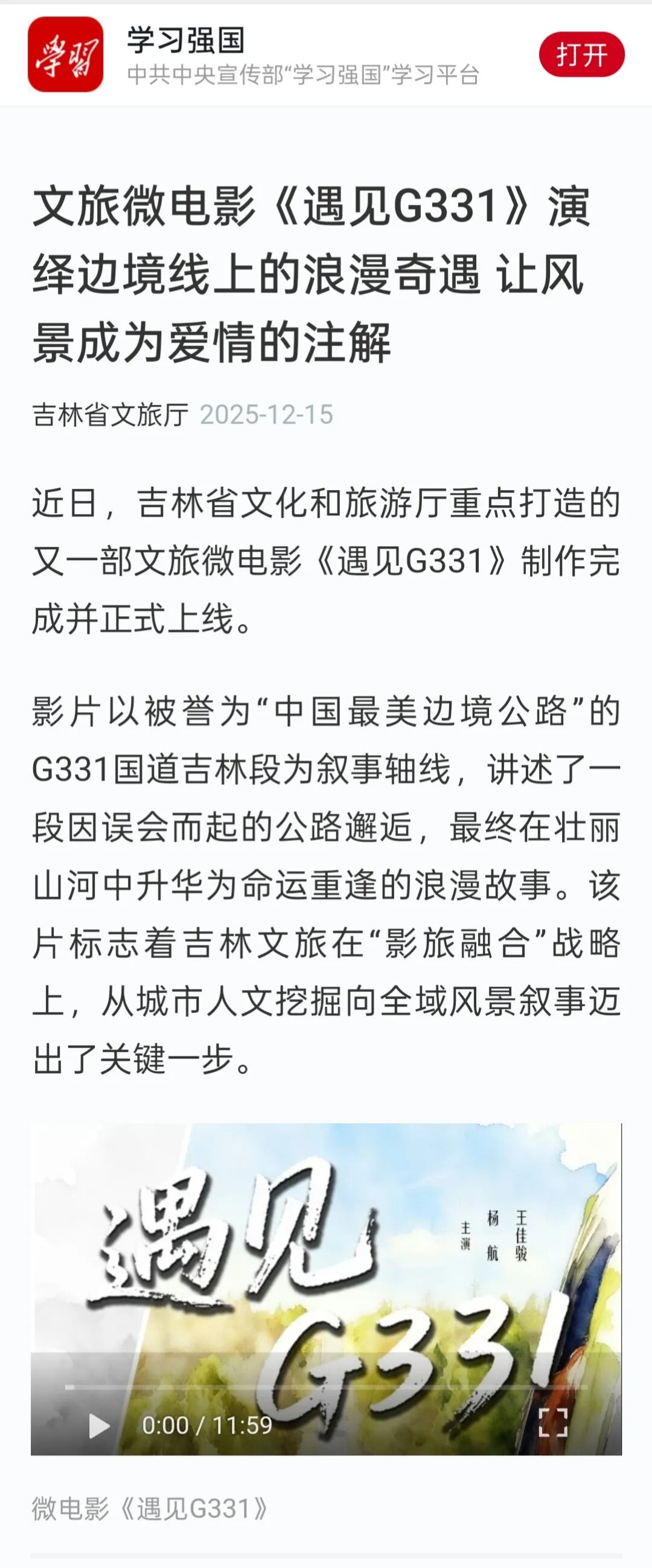 近日,河北传媒学院2016级表演系学生杨航主演的文旅微电影《遇见G331》正式登陆“学习强国”平台,凭借优质的内容呈现与积极的传播价值,获得广泛关注与好评。该片由吉林省文化和旅游厅重点打造,以“中国最美边境公路”G331国道吉林段为叙事轴线,讲述了一段因误会开启的公路邂逅,最终在壮丽山河风光中升华为命运重逢的浪漫故事。
